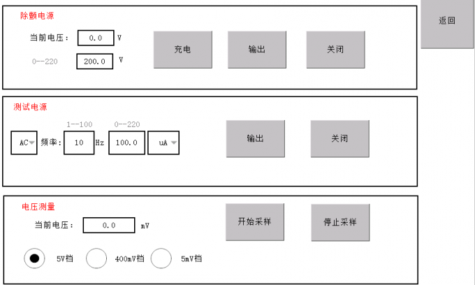 l The composite disorder instability and internal noise test page mainly sets the voltmeter parameters for the test, and displays the test time and measured peak voltage. You can also choose whether to record or empty the data, and control the start and stop of the test.